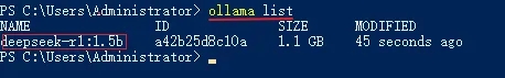 然后在命令行里输入“ollama list”来查看下载成功的模型,下图这种情况就代表一切准备就绪了。