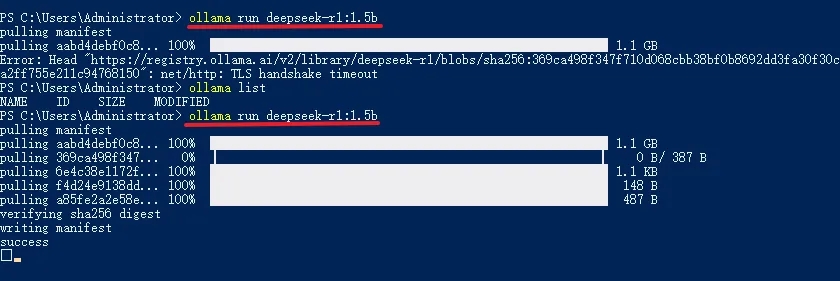 以1.5b版本为例,复制命令后粘贴到命令行中运行即可下载,速度取决于你的网速。