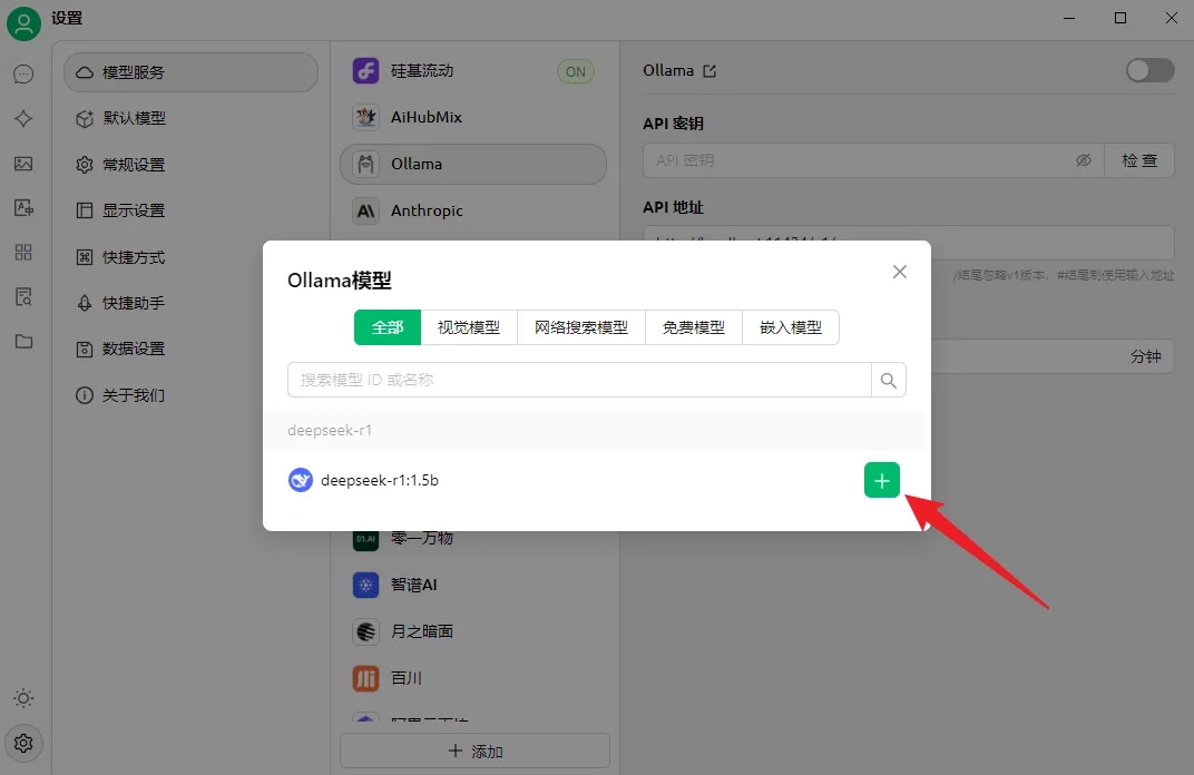 下载后打开客户端,进入设置,选择「Ollama」,API地址会自动填写,需要与下图中的地址保持一致,然后点击“管理”。