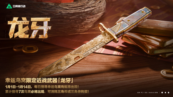 1月1日-1月14日,幸运鸟窝全新限定近战武器「龙牙」登场! 每日搜寻幸运鸟窝即有概率出现,累计搜寻7次鸟窝时,必将出现! 此外,刷新出龙牙的干员朋友们可商场活动获得。