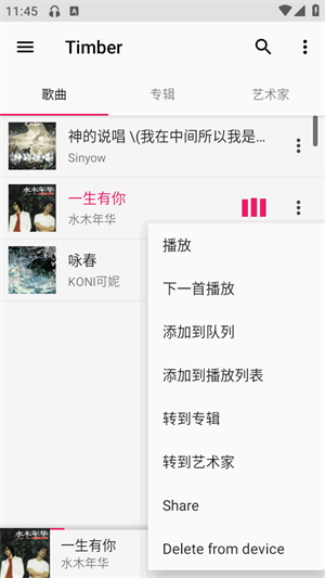 timber音乐一款聚焦于为用户提供简洁高效音乐体验,集本地音乐管理与流畅播放于一体的音乐应用。它以极简设计与实用功能,满足用户对音乐播放、整理的多元化需求,让音乐享受回归纯粹。能深度扫描设备存储,自动识别本地音乐的元数据(歌手、专辑、封面等),构建清晰有序的音乐库。支持按多种维度分类整理,如按歌手创建专属列表、按专辑打造精选合辑,让用户快速精准定位想听的音乐。