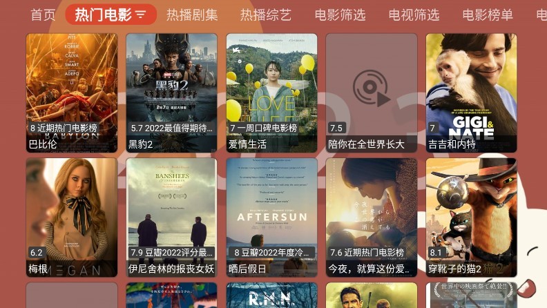 打开软件后,首页展示轮播图推荐影视、分类导航栏(如“电影”“电视剧”“综艺”“动漫”等)及热门搜索词。通过遥控器方向键或手机端滑动屏幕可浏览不同区域内容。