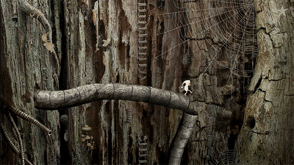3、小人回到中间的房间,转动墙上中间的两个机关。点击右边的虫子,跳到最右边的树上,再点击跳到最左边的树上,粉撒入房间的锅子。点击房外左边向水泵一样的机关几下,水流进中间房间的锅子。