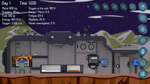 2、此阶段需要开始学习系统(右侧从下往上数第二个按钮),植物学是前期核心科技。外出建造会持续消耗氧气,而水槽初始供氧有限,因此需要尽快提升种植能力。随着机器人带回资源后,逐步升级水槽,确保氧气长期稳定,宇航员耗氧速度约为每小时0.18。