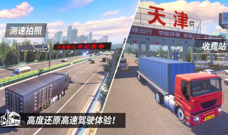 全新 3D 引擎打造写实中国城市、高速公路、乡村道路与自然景观,融入收费站、红绿灯等本土交通元素,地域特色鲜明。
