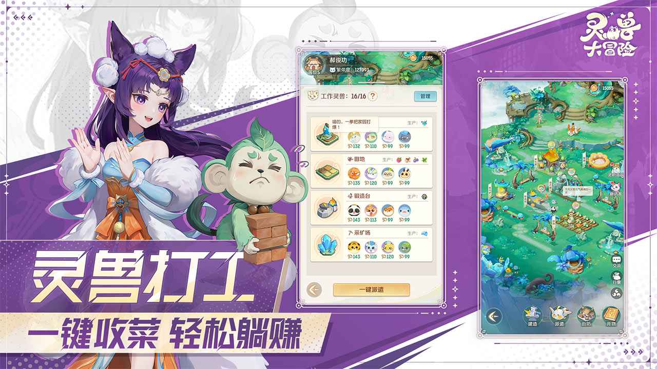 3、在线组队、轻松结交同道好友;在商城摆摊、自由交易珍稀道具;也可以建设灵兽家园,让灵兽们为你打工,躺平收取资源……诸多玩法,等你来探索!