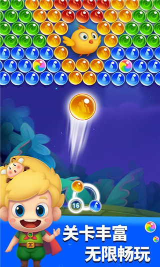 开心泡泡龙官方版正版一款深受广大玩家喜爱的经典休闲射击游戏。它以其简单易上手、画面色彩鲜明、玩法趣味十足而闻名,是放松身心、打发时间的绝佳选择。玩家需要操控一个发射器,将各种颜色的小球射向天空中散落的其他彩色泡泡。游戏的目标通常是清除屏幕上的所有泡泡,或者达到指定的分数。玩家需要根据泡泡的颜色,巧妙地利用三颗或更多同色泡泡相连的原则,让它们爆炸消失。