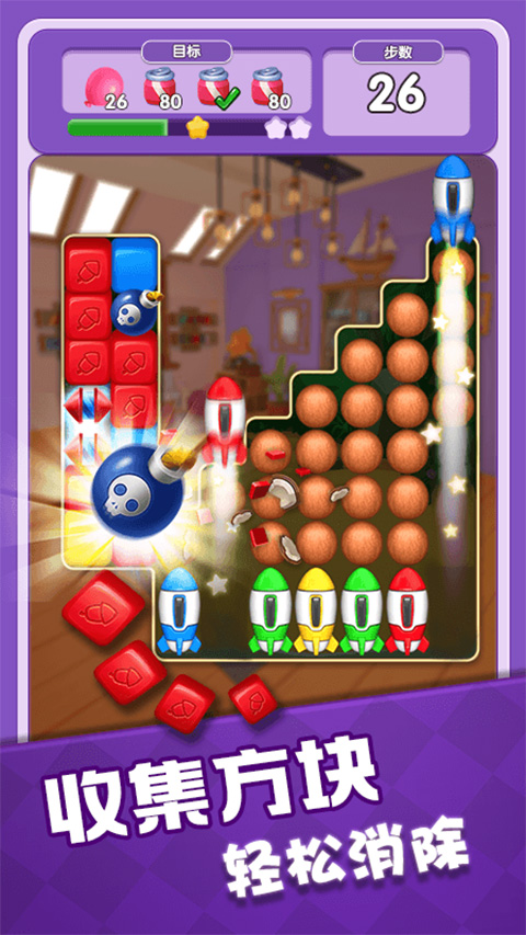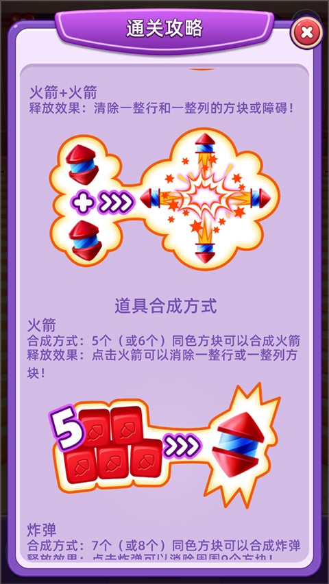 4、火箭+火箭释放效果:清除一整行和一整列的方块或障碍!道具合成方式 火箭 合成方式:5个(或6个)同色方块可以合成火箭 释放效果:点击火箭可以消除一整行或一整列方块!