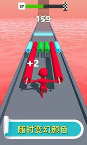 1、动态成长机制:随着收集同色圆环数量增加,角色手臂长度不断延伸,可套取更远距离的道具与高分目标,搭配场地中随机出现的加速带与变色陷阱,每局体验充满变化与策略性。