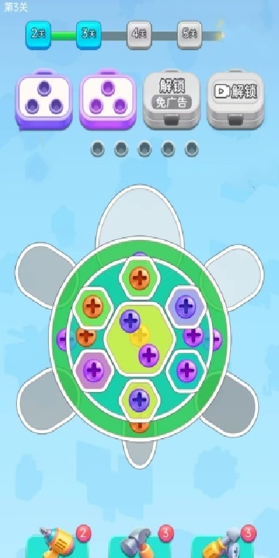 3、后期关卡加入锁链、固定螺丝等障碍,需要优先处理障碍螺丝,释放操作空间。