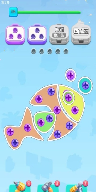 趣味消除机制:凑齐同色螺丝即可触发消除,按顺序拆卸关键螺丝能解锁连锁反应,提升闯关效率。