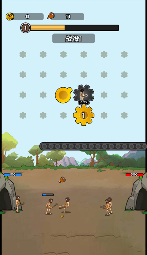 士兵齿轮:召唤步兵(近程)、弓箭手(远程)、骑兵(高血量高攻击)等兵种,支持时代升级(如铁器时代解锁龟甲阵)。