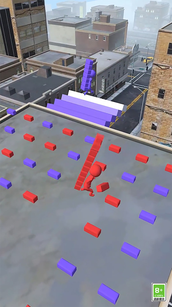 角色移动:采用虚拟摇杆或滑动屏幕控制方向,向前移动自动收集地面同色砖块,靠近砖块堆可快速拾取,砖块数量显示在角色上方。